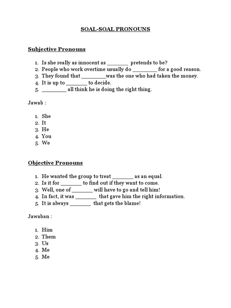 Object pronoun adalah kata ganti yang bisa menempati posisi objek, yaitu: 20 contoh soal pronoun dalam bahasa . Pronoun terdiri dari i, you, they, we, she, he, dan it. Pronoun seringkali membingungkan, so saya punya 10 contoh soal yang bisa anda gunakan untuk melatih kemampuan anda dalam hal pronoun. You always made me doubt.