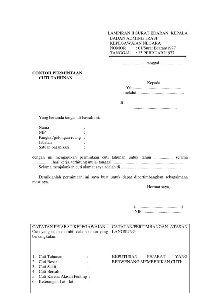 Contoh surat cuti menikah untuk karyawan 1. Jakarta humas bkn cuti melahirkan bagi calon pegawai negeri sipil cpns diberikan oleh pejabat pembina kepegawaian ppk dengan memperhatikan kewajiban cpns … Jangan takut, cpns tetap diperkenankan mengambil cuti menikah dengan landasan peraturan pemerintah republik indonesia nomor 24 tahun 1976 tentang cuti pegawai negeri sipil bahwa cpns berhak mendapat hak cuti tahunan jika telah bekerja 1 (satu) tahun secara terus menerus. Yang disebut cuti adalah hak istirahat karyawan yang meliputi istirahat mingguan cuti tahunan istirahat panjang pasal 79. Memang beberapa institusi pemerintah memiliki aturan ikatan dinas yang mana ada aturan yang menyebutkan selama masih dalam masa.